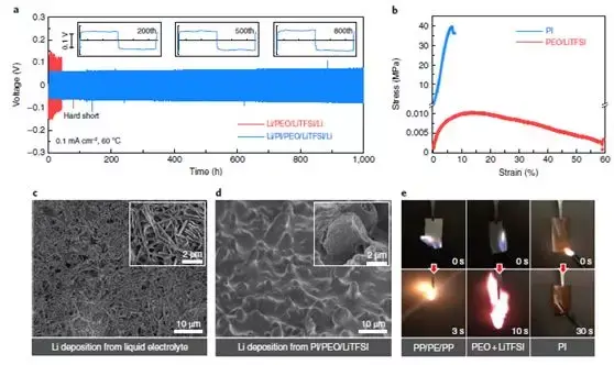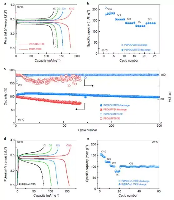利用PI/PEO/LiTFSI固态电解质组装的全固态锂离子电池具有非常好的循环稳定性和安全性。