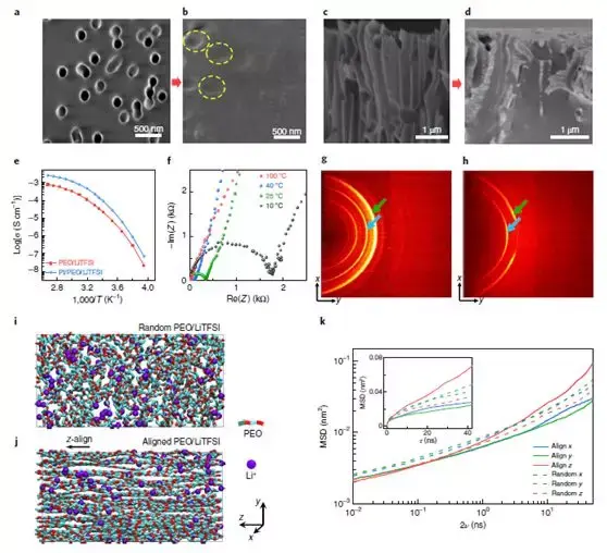 PI膜中垂直排列的孔道结构能有效的增强填入聚合物(PEO/LiTFSI)的离子电导率(2.3×10-4 Scm-1 在 30 ℃时),而PEO/LiTFSI薄膜的电导率仅为5.4×10- 5 S cm - 1(30°C)。