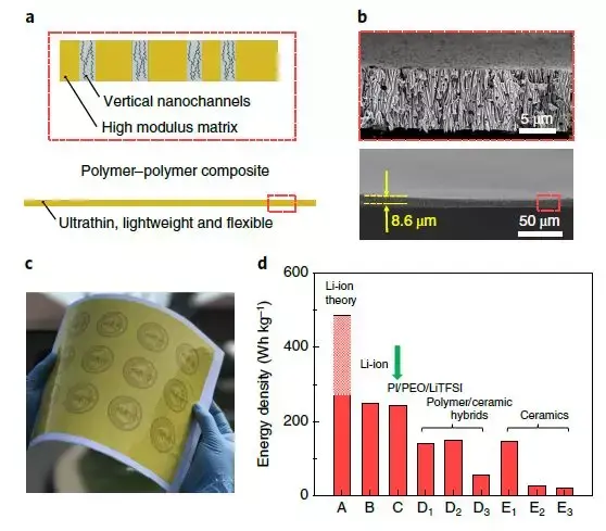 将PEO/LiTFSI填充到仅有8.6 μm厚的多孔聚酰亚胺(PI)膜中,高模量PI膜防止枝晶渗透,多孔通道增强SPE填料的离子导电性。使用PI/PEO/LiTFSI电解质时,全固态电池的能量密度与液态电解质电池相当(246 Whkg - 1),高于其他全固态电池。由于全固态锂离子的电池外壳可能比液体电解质锂离子电池更简单,所以固体聚合物-聚合物复合材料锂离子电池的能量密度可能会更高。