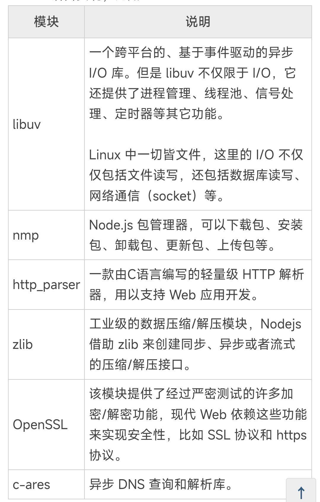 当然,并不是所有的本地模块都能找到合适的,Node也自己编写了几个模块,典型的代表就是 Libuv。Libuv 是 Node.js 最核心最基础的模块,Node完全基于 Libuv 而构建。