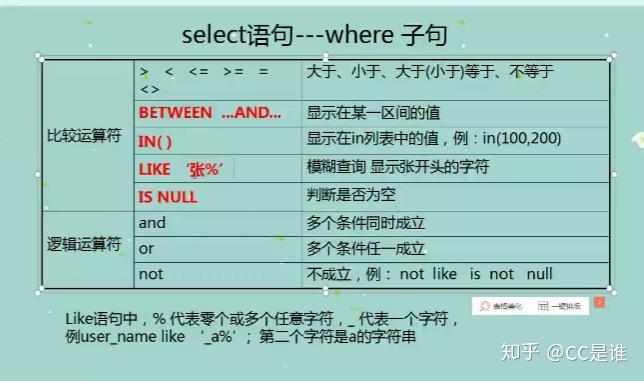 说明:1)<>与!= 效果相同;2)like后也可以跟‘_’,代表一个字符,‘%’是任意长度字符;