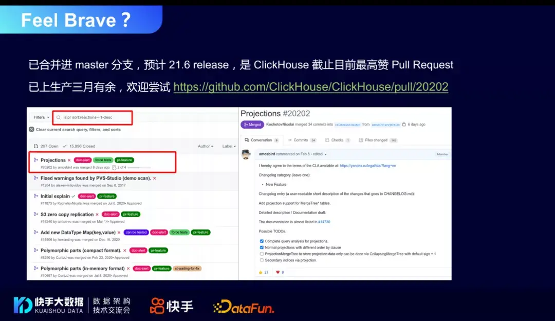 这个功能目前已经合并到master,预计下个月会release,是ClickHouse开源5年来最高赞的PR,在快手内部已经使用了3个多月,也欢迎大家尝试使用。