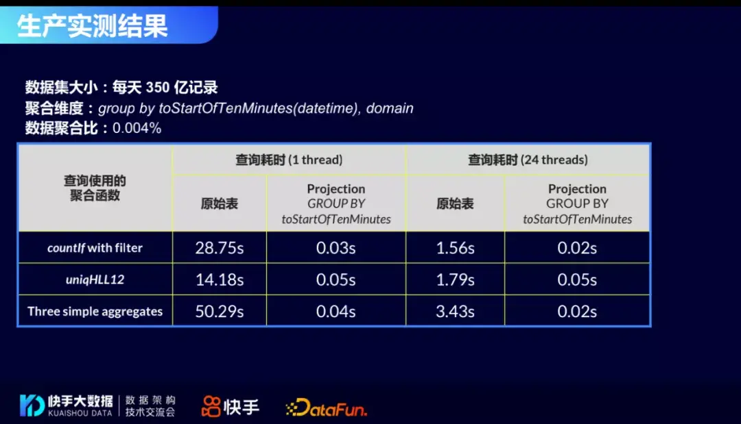 接下来说一下生产实测效果。首先,这个Projection包括物化的效果基本都是跟数据集和查询紧相关的。数据集大小:每天350亿条记录,按照10分钟为粒度,取某一个维度列进行预聚合,聚合比大概是十万分之四。这个效果分两部分:一个是聚合函数的使用量,比如说一个、两个或者三个的使用量,这时候提升的效果基本上是根据聚合函数的使用多少来体现的。比如最后这个用了三个聚合函数,可能提升的效果就更明显,因为你的计算量减少的更多;第二个是并发层次,Projection基本上不需要什么计算资源,所以在并发很高的情况下,并不会有太多提升,但是它减少了很多的计算资源开销,因此Projection做看板渲染是非常友好的,比如说多个人同时打开看板,执行很多个聚合查询,查询并发可以提的非常高,可以同时把看板渲染出来,原始表的话可以就一个看板,打开之后,别人就刷不出来了。