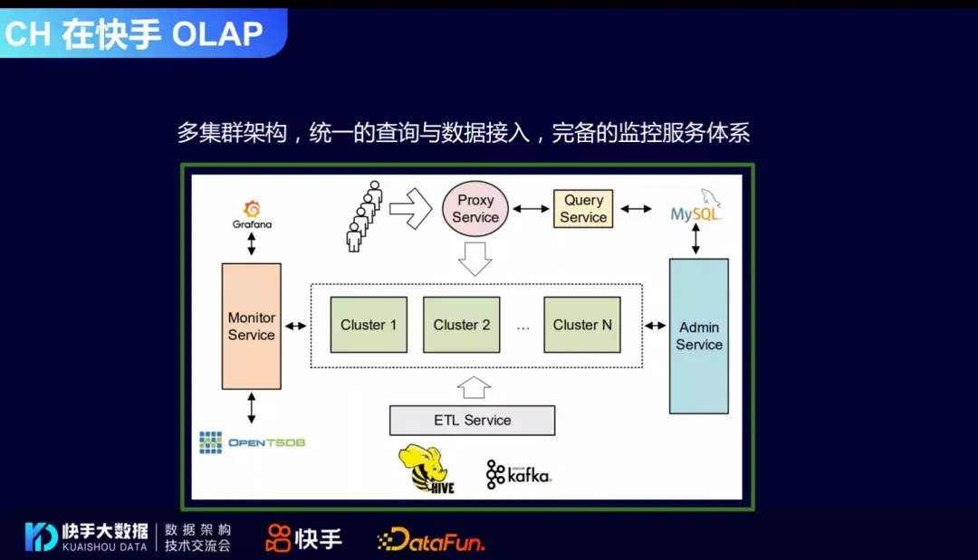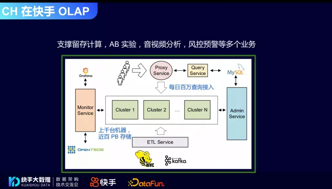 - “白盒”计算模式,ClickHouse是一个非常容易做嵌入和扩展的系统,非常适合研发人员进行利用;“手动挡”应用模式,ClickHouse对于新手来说用起来还是比较费劲的,针对这个问题,快手做了一系列的服务包装和架构上的设计。