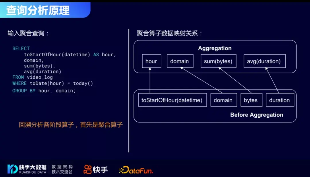 Aggregation这一层涉及到参数准备的过程,就是hour、domain、sum(bytes)、avg(duration)这几个环节。需要提供的数据是domain、bytes、duration。