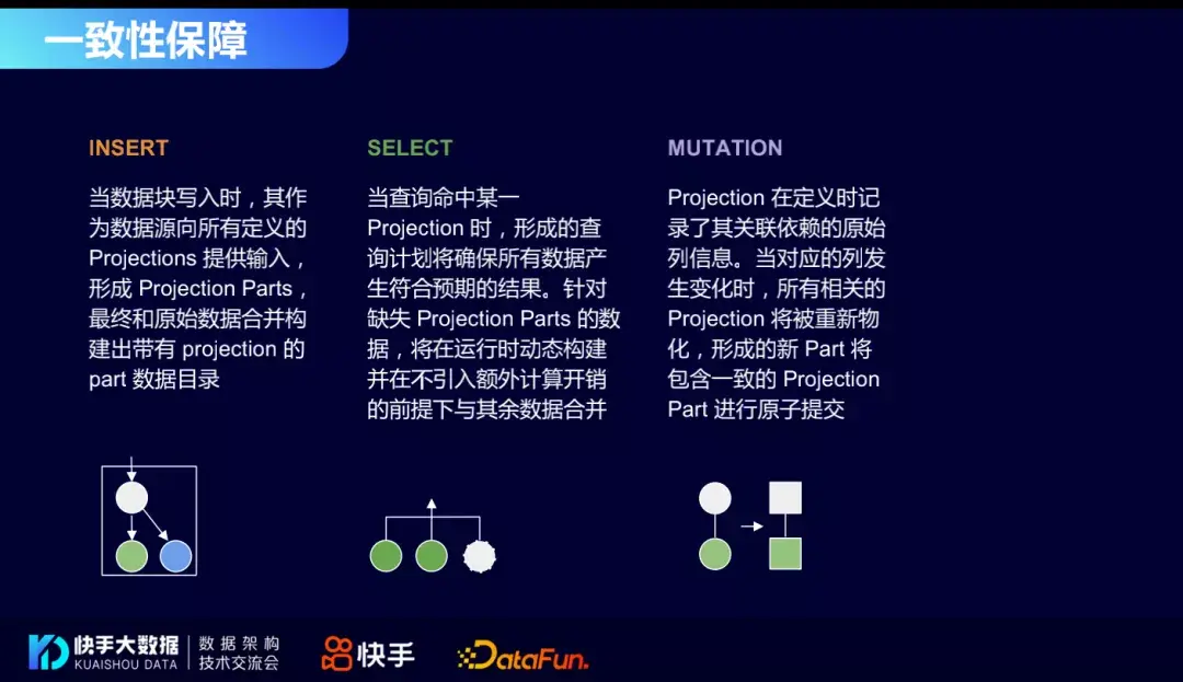 - Projection存储:Projection存储主要就是解决一致性的问题,怎么样在ClickHouse物化视图不一致的情况下,通过存储的设计,把物化出来的结果和原始的结果进行强一致的绑定。
