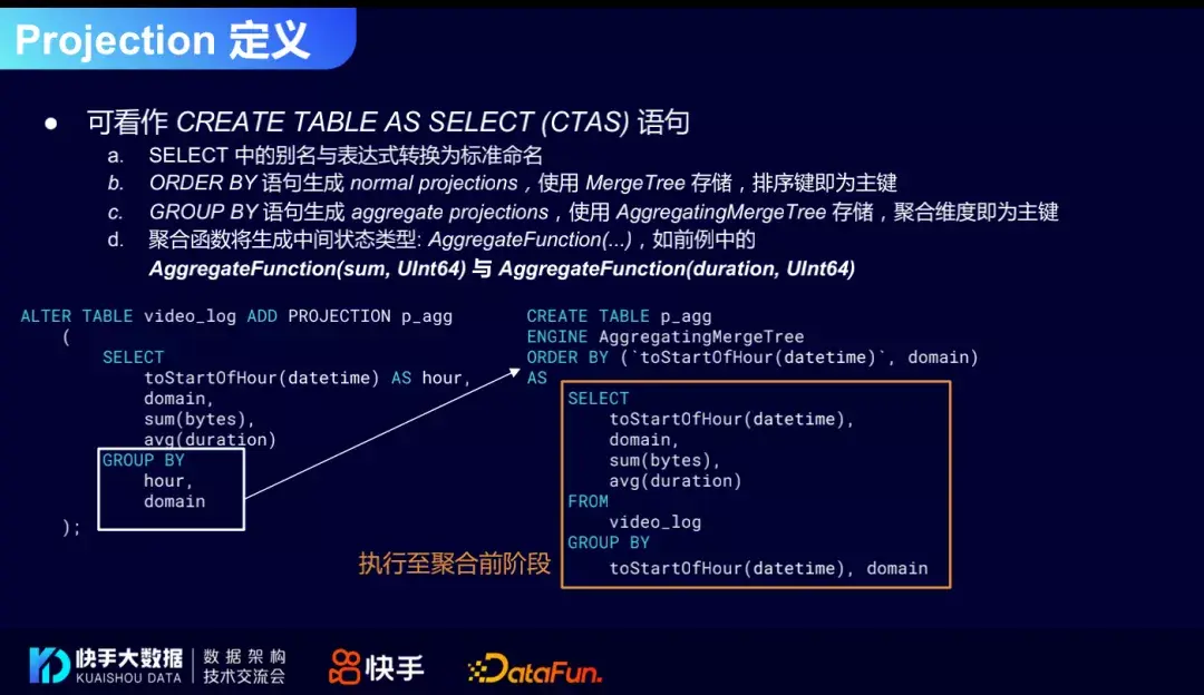 Projection的定义其实是和物化视图是类似的,物化视图的定义基本上就是CREATE TABLE AS SELECT... Projection通过ORDER BY这种模式比较直观,可以按照顺序调整结构;GROUP BY就是用这个方式去做聚合,会把顺序拆解,选出里面的预聚合的部分,这部分涉及到一点:需要把里面所有的指标找到中间的那个状态是什么,这种模式可以用”手动挡”方式实现,Projection的定义可以帮你自动实现,这是比较好的用户体感。