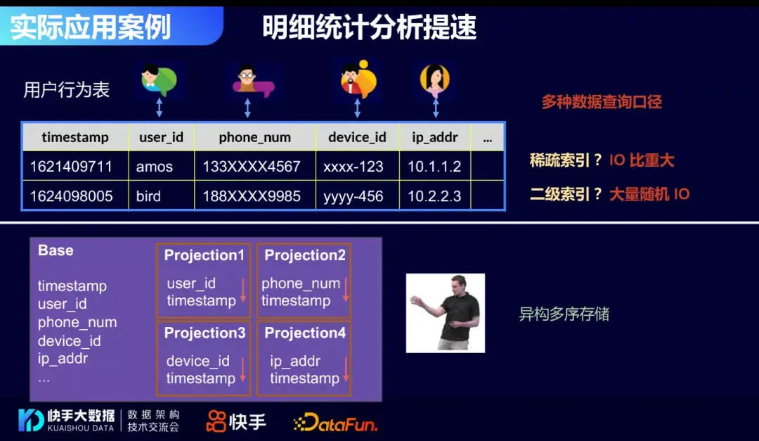 在实际应用案例中,会有这样的场景:一个用户,在行为表中,可能会有多种口径的查询方式,比如user_id, phone_num, device_id, 不同的人会通过不同的方式去查,这样在取数的时候,通过一维的排序肯定是不够的,如果通过稀疏索引或者二级索引也会带来其他的问题。如果用Projection的话,可以根据不同的口径,选出需要的列,进行异构多序存储,这样就可以针对不同用户的取数口径,都能够达到提速的效果。