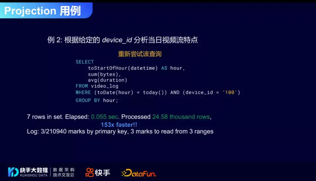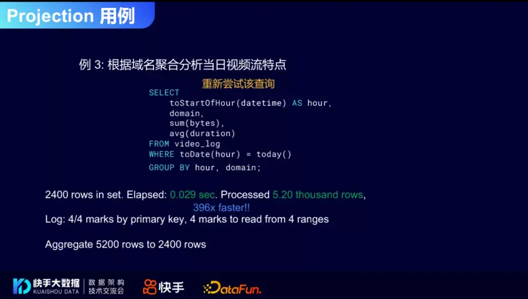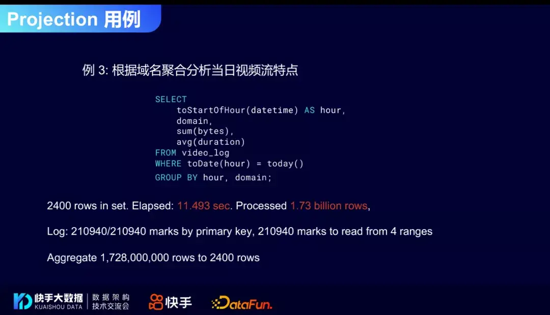 再来看一个Projection的用例,比如按照域名聚合(大概100个基数),来做当日视频流特点分析,这个其实在ClickHouse里面性能已经很不错了,17亿的数据,ClickHouse单机大概11秒就跑结束了,已经可以体现它的高效性,但是仍然不足以去渲染看板。看板是希望能够即席分析,点开就能看到。