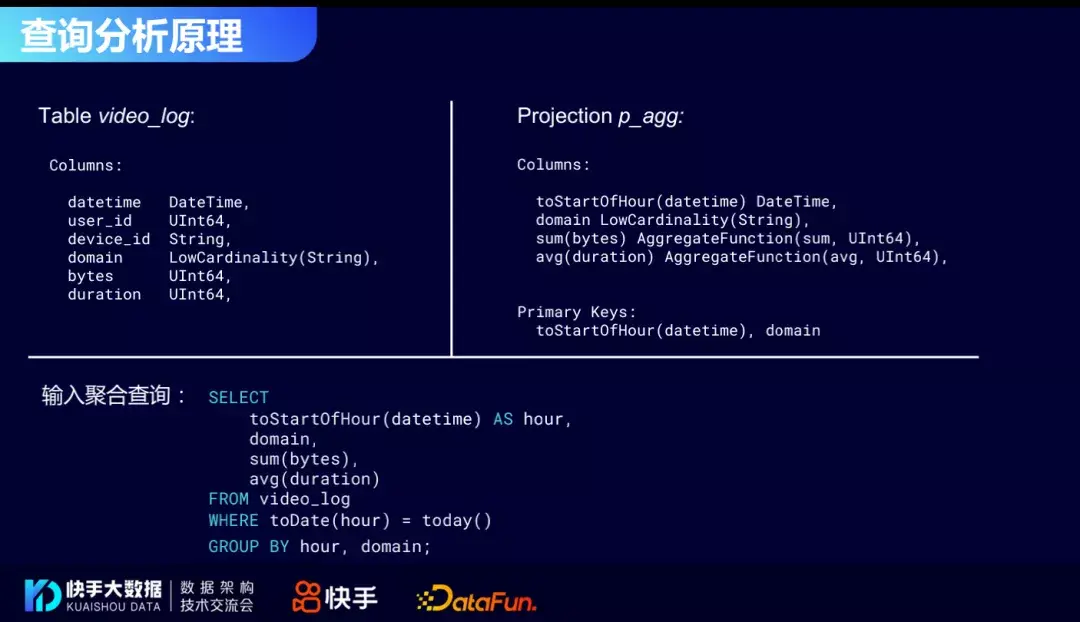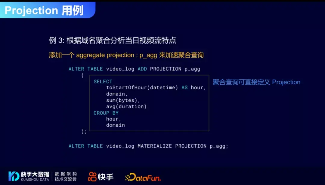 我们现在为这个查询定义一个预聚合的Projection,只需要表明需要查询的加速是什么样的,比如就是group by以hour为粒度,以domain为维度,然后查看sum和avg的结果,进行MATERIALIZE的操作。