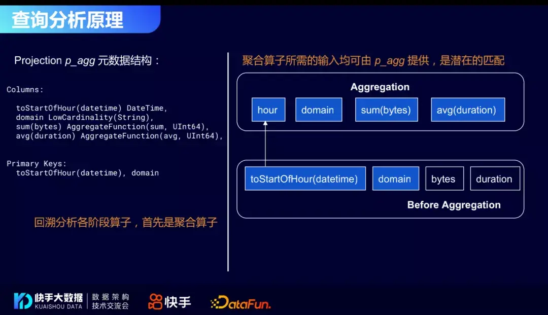 首先查询需要从存储里把列需要的数据读出来,然后进行有效的过滤,最后准备好要聚合的参数,比如bytes、duration,最后完成聚合的动作。我们需要看每一步Projection的数据能不能提供他们所需要的输入,这样的话就能知道这个Projection是否命中。接下来详细的看看: