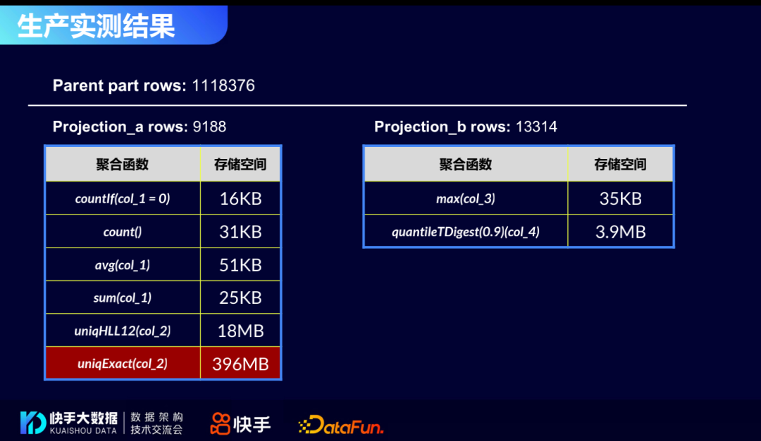 从另外一个角度看,主要就是存储成本。存储成本主要是看聚合指标使用的函数,因为我们现在的Projection支持任意函数,这时候就要考虑哪些指标得规避,简单的指标比如上图中绿色部分的,基本可以随便建,没有什么存储开销,基本都是KB级的。