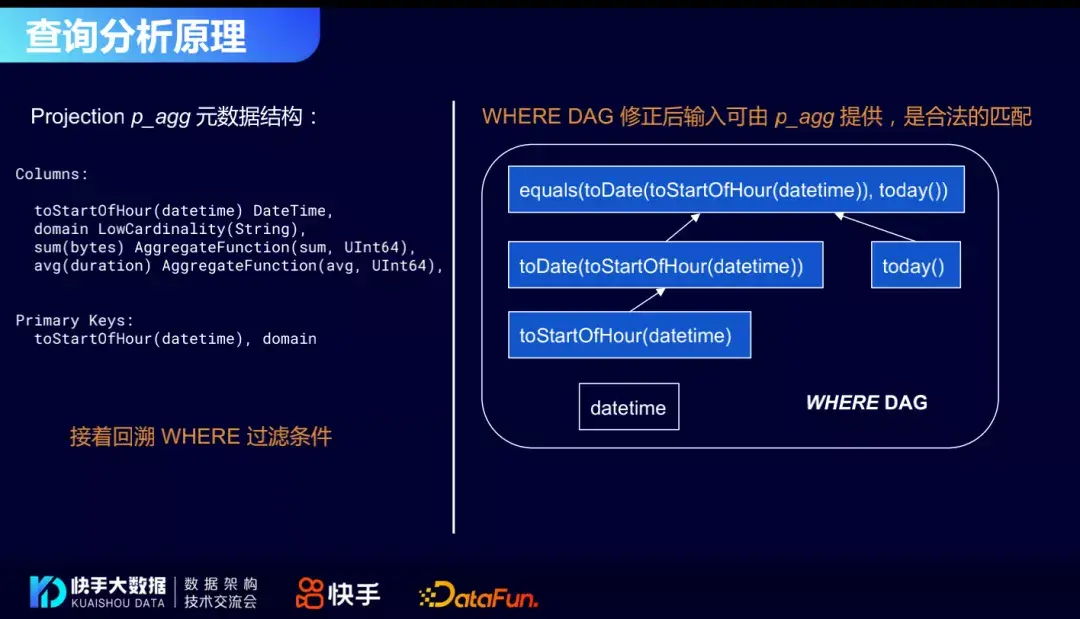 - Projection查询分析:回溯分析查询计划,使用标准表达式名称进行匹配验证,使得可以命中Projection,得出正确的查询结果,并根据选出来的Projection重建执行计划,完备的实现一致性的查询效果。