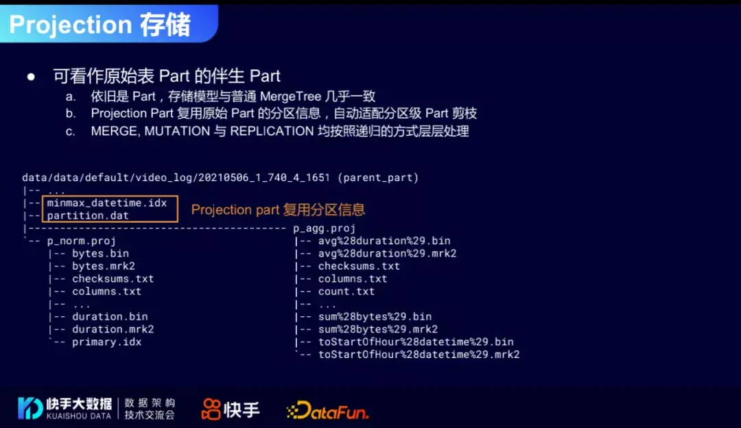 Projection本身在ClickHouse系统下是一种伴生的Part,熟悉ClickHouse的同学可能知道,ClickHouse的存储是一个一个的文件夹,每一个文件夹叫做一个Part,Projection就是在Part下的子Part,跟着这个Part一起走,所以它们的分区信息是一致的,能够同时和原始查询的分区剪枝的动作一致,同时能够保证所有和Part相关的操作的一致性,并且进行递归处理,每层对这个Part进行MERGE或者MUTATION的时候,Projection也会跟着一起MERGE或者MUTATION。