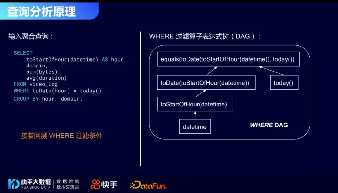 这里有一个WHERE执行树,WHERE执行树本质上是一个DAG表达式,它表达的意思是:现在有一组列,这一组列怎么样通过不断的变换形成新的列,最后产生一个谓词equals,判断这个谓词是真还是假。