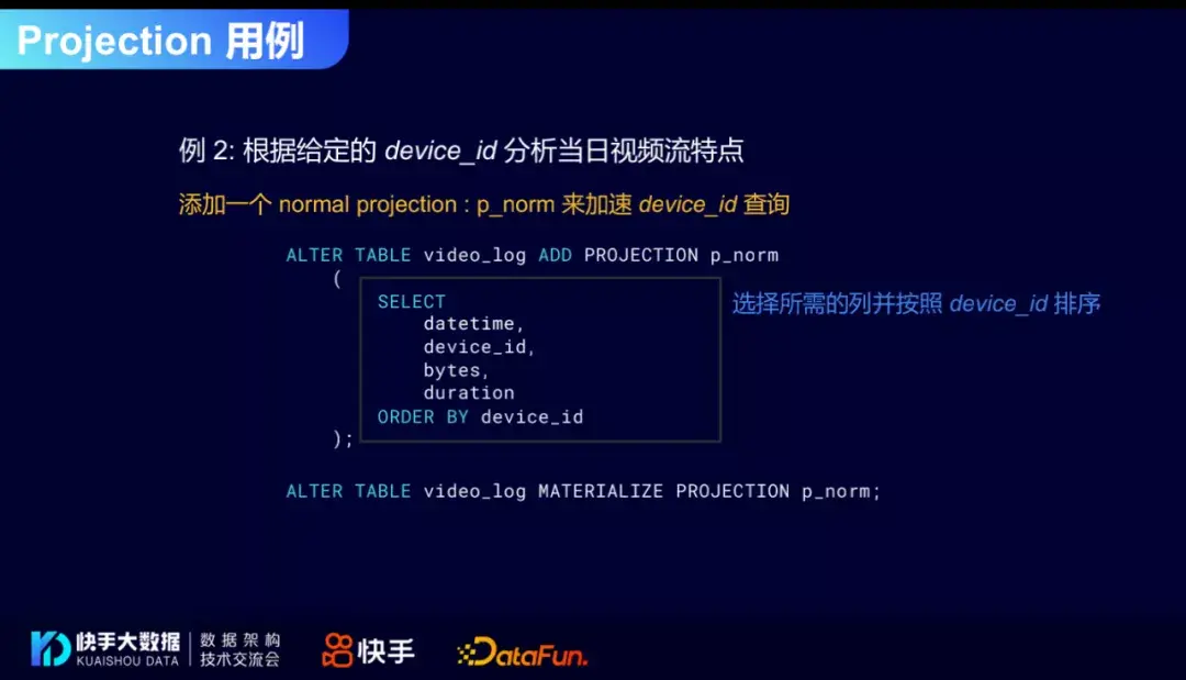 我们尝试为这个表建一个Projection,建Projection的操作很简单,就是对这个表进行一个alter的操作。Projection里面定义了你需要查询的那些列,然后按照device_id进行存储,选出这些列之后,由于它是lazy的模式,可以手动进行物化。为了演示效果,我们手动对这个Projection:p_norm进行MATERIALIZE操作。