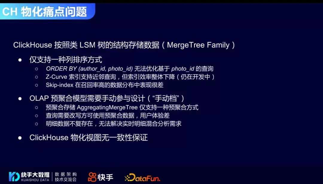 - 仅支持一种列排序方式,虽然社区提供了一些解决方式如Z-Curve、Skip-index,但是都存在一些问题。