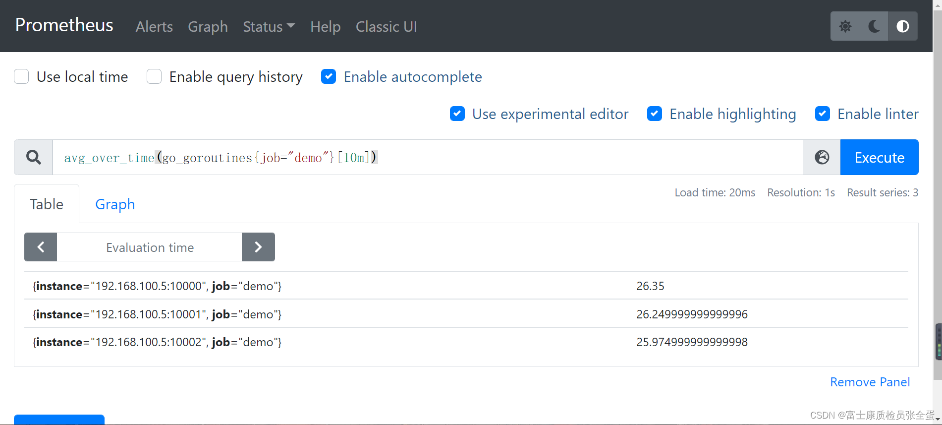 在页面 http://localhost:9090/graph 中,输入下面的查询语句,查看结果,例如: