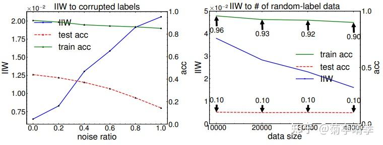 然后,我们测试了下载100%噪声下增加更多的数据(下右图)。可以看到,无论加多少噪声训练数据,测试精确度都稳定在瞎猜10%的水平,这是符合我们的直觉的。同时,由于噪声数据变多,模型拟合训练集的能力也下降了。这也反映在了逐渐降低的IIW上。这说明,哪怕在完全噪声的训练数据的情况下,IIW仍然可以为泛化误差的一个有效度量指标。