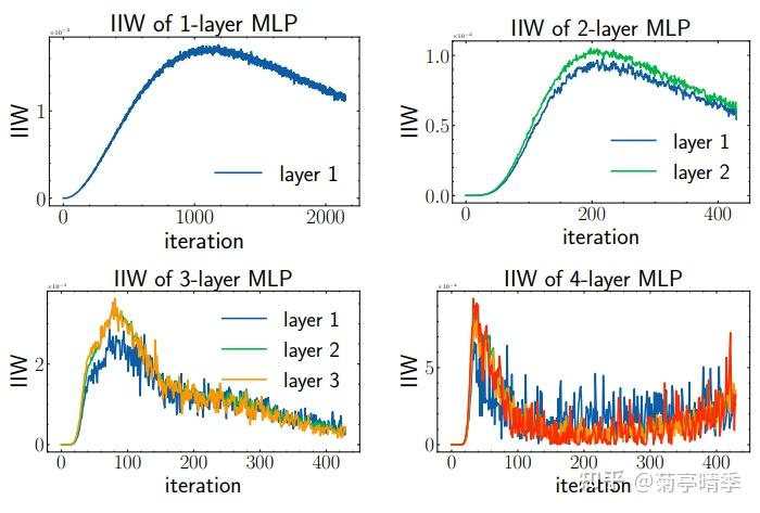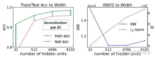 同样,我们试试加大宽度,看看IIW的变化。下图中我们发现,IIW和不同网络宽度下的网络泛化能力高度同步。比如,在512和4096宽时,网络的泛化误差(generalization gap),或者说训练精确度减去测试精确度达到最低。同时,IIW也在此时达到最低点。