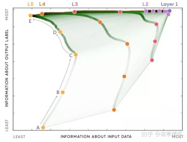 这里的 I 是互信息。那么,Tishby团队发现神经网络的训练过程遵循着 " 记忆-遗忘" 两阶段的的过程。在记忆阶段,神经网络尝试记住所有的标签信息,即不断提高 I(T;Y) ;在遗忘阶段,神经网络尝试在保持标签信息的同时,遗忘掉关于输入的信息,即降低 I(T;X) 。呈现出来的结果就是下图中,Y轴是标签信息,X轴是输入信息,每一条线是网络中的一层。可以看到,标签信息随着训练一直在提高,对应了记忆阶段;而输入信息基本是先升高,再下降,对应了遗忘阶段。