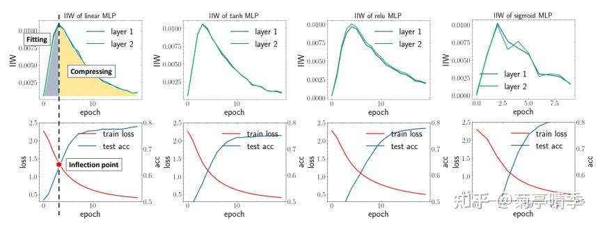 如下图所示,我们选择了四种激活函数,分别是Linear(无激活函数), tanh,ReLU,和sigmoid,并且画出训练损失和度量的information in weight (IIW),即 I(w;S) 。我们可以看到,所有四个网络都明显的显示出了两阶段的现象:在第一阶段IIW先升高,达到顶点之后进入第二阶段开始下降。并且,可以明显看到,这个IIW的顶点和我们的损失函数值,以及测试精度的拐点基本重合!这是不是说明网络的学习行为和IIW的变化高度一致呢?在记忆阶段,网络也在快速学习;而在遗忘阶段,网络开始"精耕细作",慢慢地稳步提高。