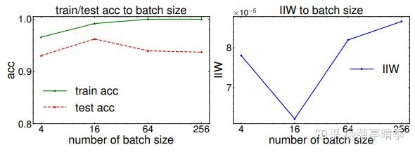 我们继续改变batch size训练网络,并且看看IIW的变化。我们发现在batch size=16的时候,泛化误差达到最小,同时IIW也达到最低点。
