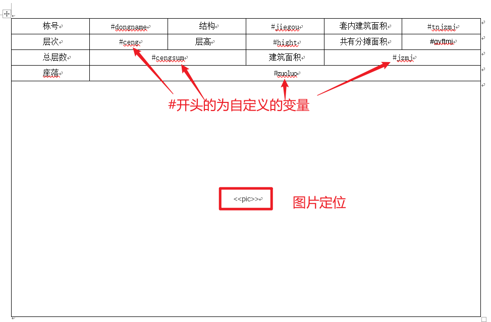 参考了网上的很多文章, 在Python脚本中Word文档数据定位的逻辑其实跟我们在office软件中进行关键词的替换类似 ;首先我们也是在Word文档中定义了很多关键词,然后通过Python脚本用Excel中的数据去替换这些关键词;所以这里就要与第一步获取的Excel数据字典对应起来。如楼层表的数据和图片的定位如下图所示。