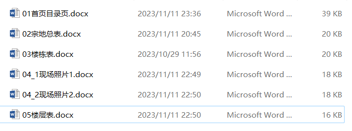 本文操作word文档使用的Python库为docx,通过docx库可以实现表格数据和图片写入到word文档中。因为这次的word文档报告比较有规律,如一个楼栋的信息保存到word文档的一张表中(一楼一张表保存到word文档的一页),楼层的每层信息保存到word文件的一张表中(一层一张表保存到word文档的一页中)……,所以把word文档以内容进行划分为多个word文档模板,Python脚本就可以读取对应的模板批量生成对应的报告。word文档模板文件列表如下图