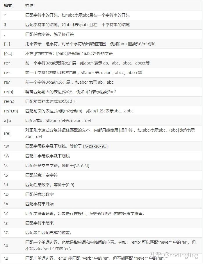 正则表达式语法由字符和操作符构成, 字母和数字表示他们自身。标点符号只有被转义时才匹配自身,否则它们表示特殊的含义。 常用的操作符模式如下: