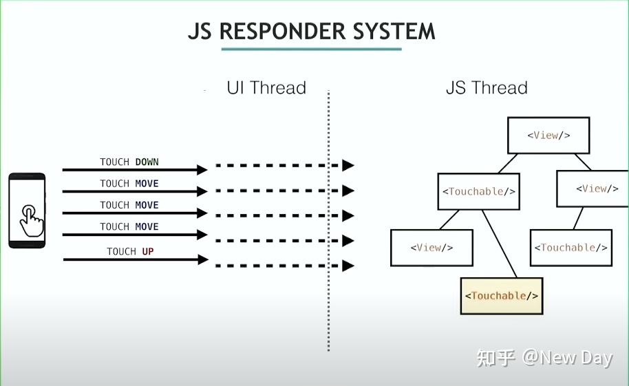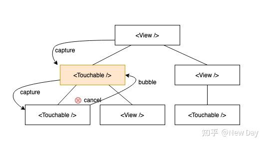 在RN端,当一个触摸事件开始时,会进入事件的捕获阶段,根据点击的视图区域,找到能响应事件的最深的子组件,然后从子组件开始冒泡事件(子组件可以判断是否成为响应者响应事件,不响应则往上冒泡)。需要注意的是,一次事件只会有一个视图组件成为事件的响应者,然后触发对应的事件。