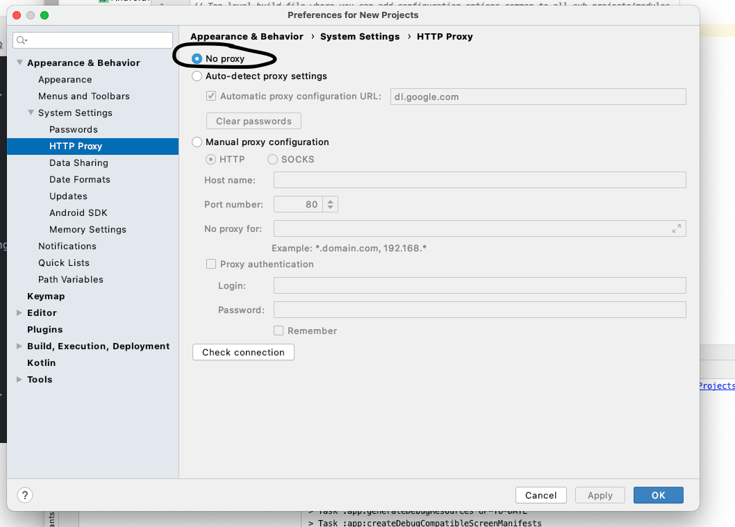 做完第一步之后build还是会报错,彻底关掉as之后,重新打开,在HTTP Proxy设置中将“Auto-dectect proxy settings" 切换为 “No proxy".