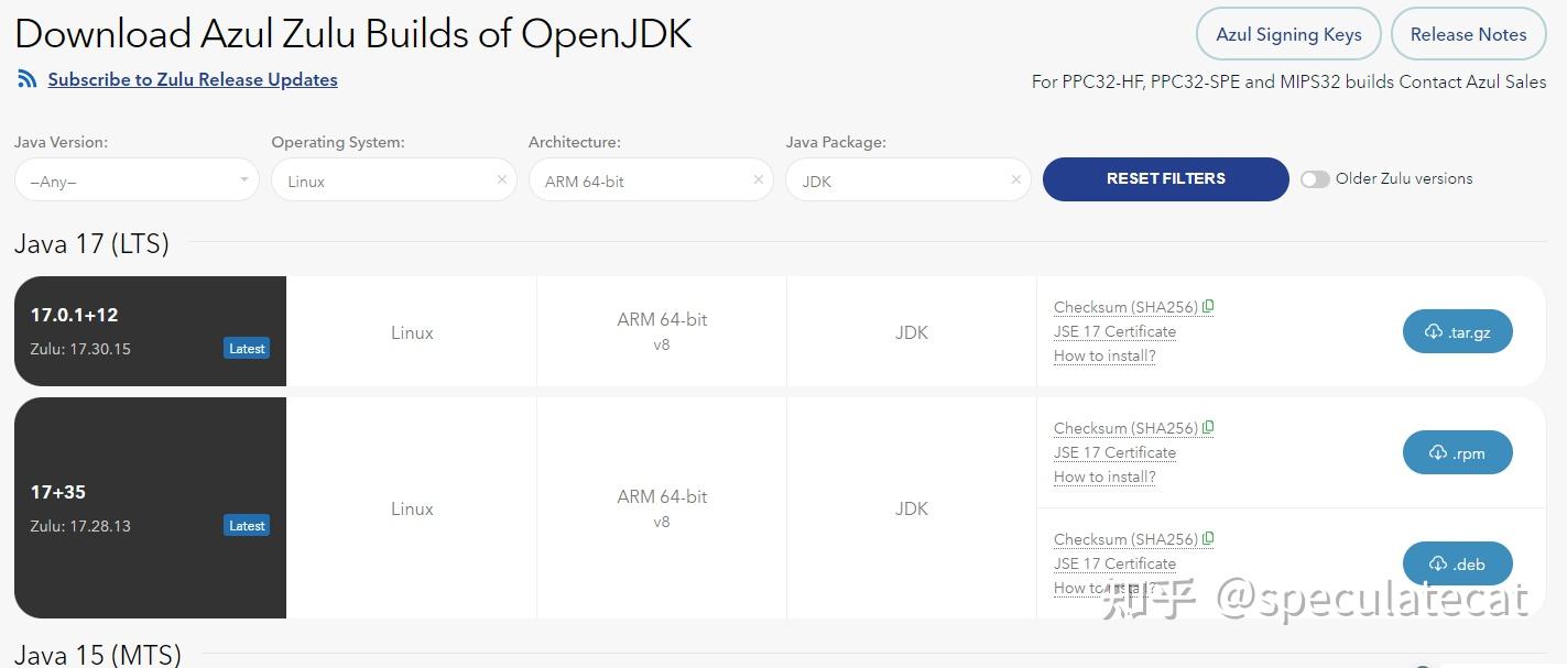 以我的选择为例,操作系统选择 Linux,架构选择 ARM 64 bit,Java包选择 JDK,就可以看到下面就是可以下载的包。
