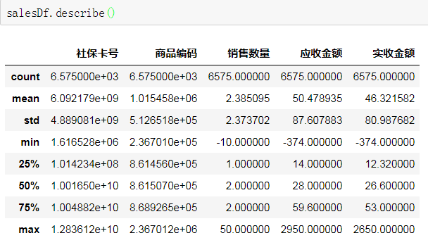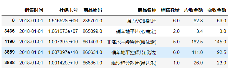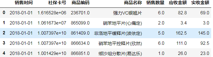 购药时间、社保卡号、商品编码、商品名称、销售数量、应收金额、实收金额