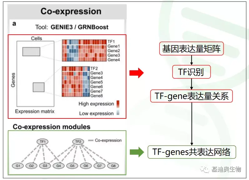 第一步由GENIE3或GRNBoost软件完成,这里以GENIE3为例介绍。GENIE3 (GEne NetworkInference with Ensemble of trees) ,基于树的基因网络推理,是一种从基因表达数据推断基因调控网络的方法[3]。软件以单细胞基因表达量矩阵为输入文件,以每个目标基因 (gene) 为输出,以转录因子 (TF) 为输入,构建P个随机森林树(P=矩阵中基因数量),并计算每个TF与gene之间的重要性评分 (IM) ,最终可以获得TF-genes共表达模块。最后删除IM低于阈值的基因关系,过滤基因数低于50的模块。如果觉得不太好理解,下图2也为大家做了简化~