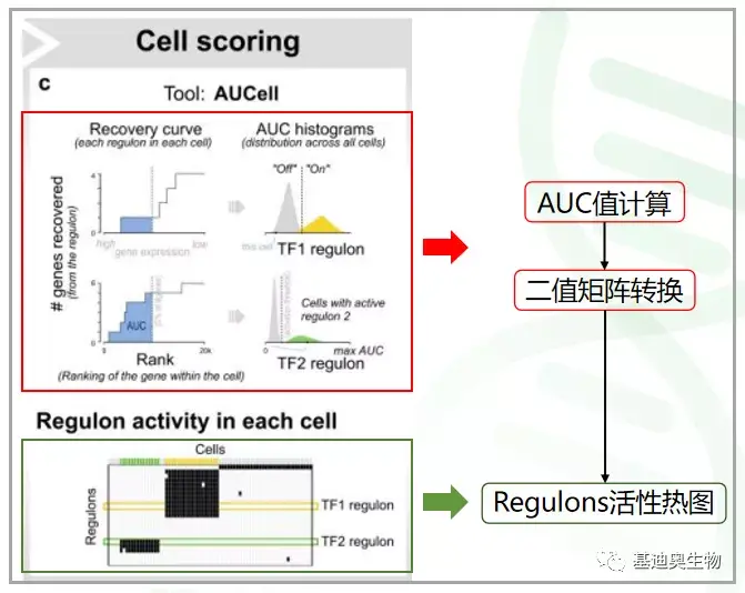 第三步就是Regulons活性定量。这一步由AUCell软件完成,AUCell是一种新的方法,允许在scRNA-seq数据中识别具有活性基因调控网络的细胞。