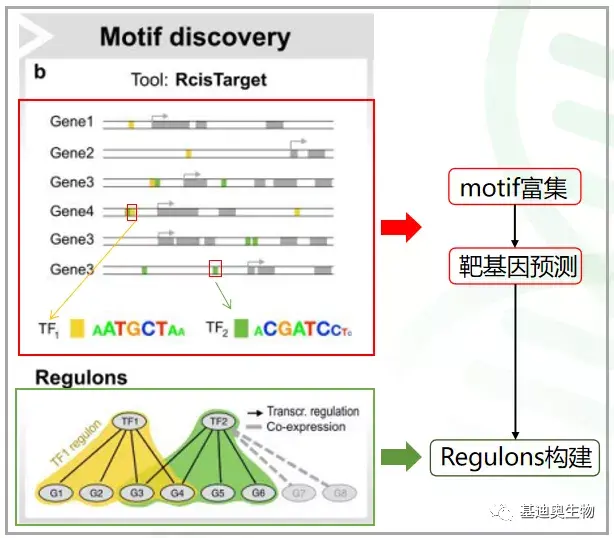 那么具体验证过程,首先基于gene-motif数据库,每个motif对模块中所有基因进行累积,模块中的基因排名越靠前,累积曲线越高,曲线下面积 (AUC) 越大,表明motif在该模块中的富集程度越高,然后对每个模块选取显著富集的motif,并预测其靶基因,最终综合TF-genes模块和靶基因预测结果,构成一个包含了TF和靶基因的基因调控网络模块 (regulons)。下图3也为大家做了简要概括。