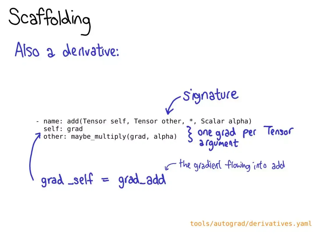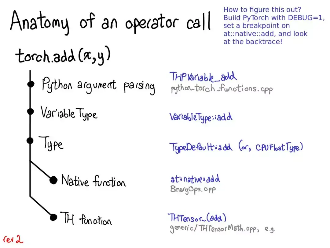 我在上面用蓝色标注了最重要的部分:你可以看到这里使用了一个 PythonArgParser 类来从 Python args 和 kwargs 取出 C++ 对象;然后我们调用一个 dispatch_add 函数(红色内联);这会释放全局解释器锁,然后调用在 C++ 张量自身上的一个普通的旧方法。在其回来的路上,我们将返回的 Tensor 重新包装进 PyObject。