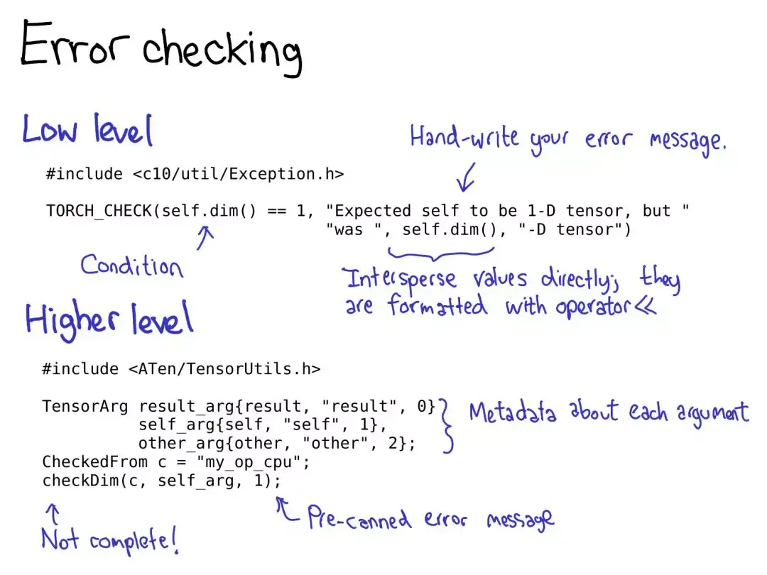 错误检查可以在低层 API 完成,也能通过高层 API 实现。低层 API 只是一个宏 TORCH_CHECK,其接收的是一个布尔值,然后还有任意数量的参数构成错误字符串(error string)以便得出结论看该布尔值是否为真。