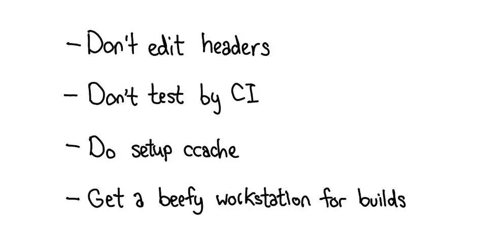 - 如果你编辑一个 header,尤其是被许多源文件包含的 header(尤其当被 CUDA 文件包含时),可以预见会有很长的重新 build 时间。尽量只编辑 cpp 文件,编辑 header 要审慎!