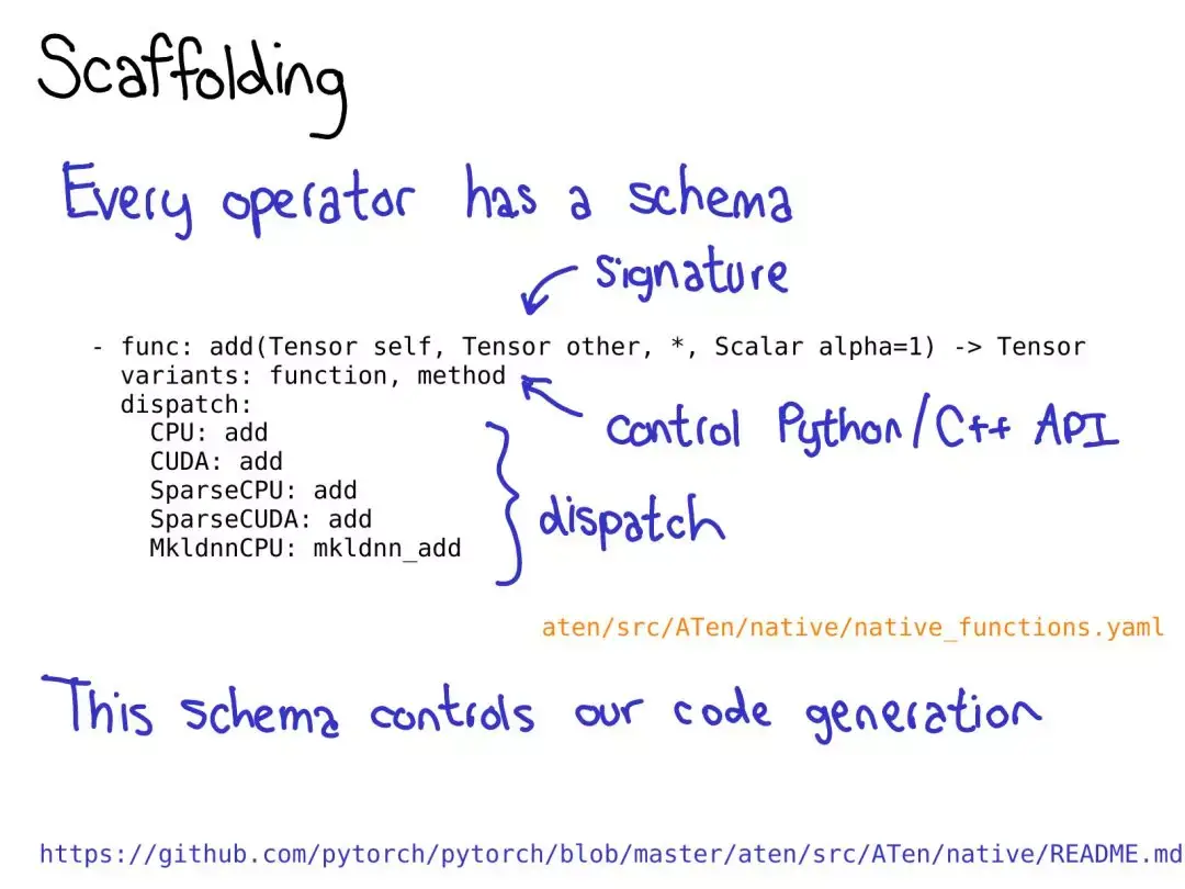 要充分利用 PyTorch 的代码生成能力,你需要为你的算子写一个模式(schema)。这个模式能提供你的函数的 mypy 风格类型,并控制是否为 Tensor 上的方法或函数生成捆绑包。你还可以告诉模式针对给定的设备-布局组合,应该调用你的算子的哪种实现。