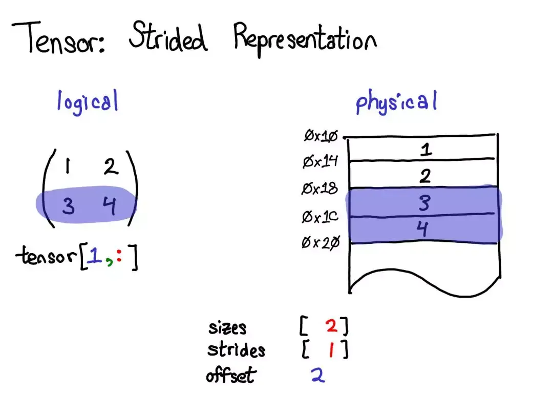 也许会有多个张量共享同一存储。存储会定义张量的 dtype 和物理大小,同时每个张量还会记录大小、步幅和偏移量,这定义的是物理内存的逻辑解释。