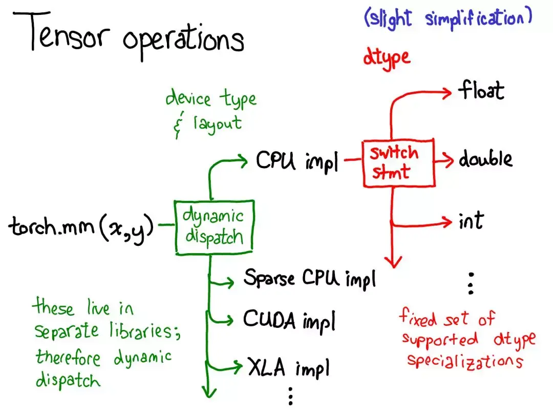 我们已经介绍了一些张量的数据布局(有人可能会说,如果你正确地理解了数据表示,其它一切都会自然到位)。但还是有必要简要谈谈如何实现对张量的操作。在最抽象的层面上,当你调用 torch.mm 时,会发生两次调度: