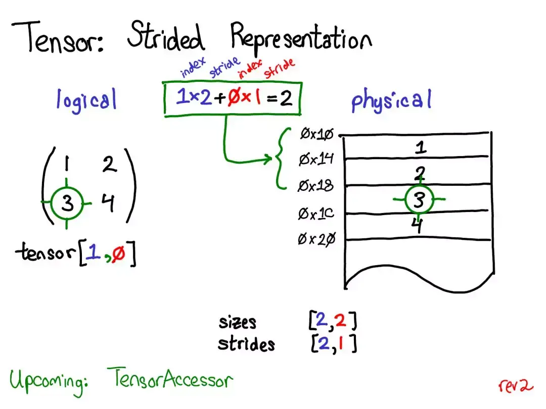 假设我想要读取我的逻辑表示中位置张量 [0,1] 的元素。我该如何将这个逻辑位置转译为物理内存中的位置?步幅能让我们做到这一点:要找到一个张量中任意元素的位置,我将每个索引与该维度下各自的步幅相乘,然后将它们全部加到一起。在上图中,我用蓝色表示第一个维度,用红色表示第二个维度,以便你了解该步幅计算中的索引和步幅。进行这个求和后,我得到了 2(零索引的);实际上,数字 3 正是位于这个邻接数组的起点以下 2 个位置。