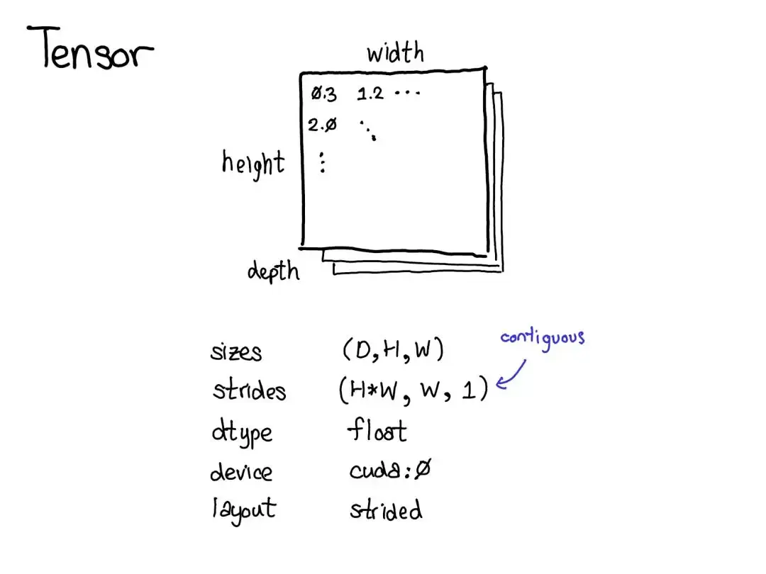 另外还有一个你可能没那么熟悉的元数据:步幅(stride)。stride 实际上是 PyTorch 最别致的特征之一,所以值得稍微多讨论它一些。