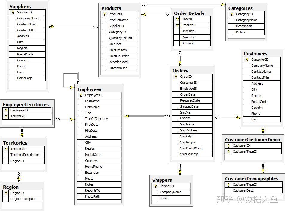 众所周知的罗斯文(Northwind)数据库代表零售应用程序的数据存储。您将找到客户、产品、订单、员工、托运人和类别以及他们之间的互动。