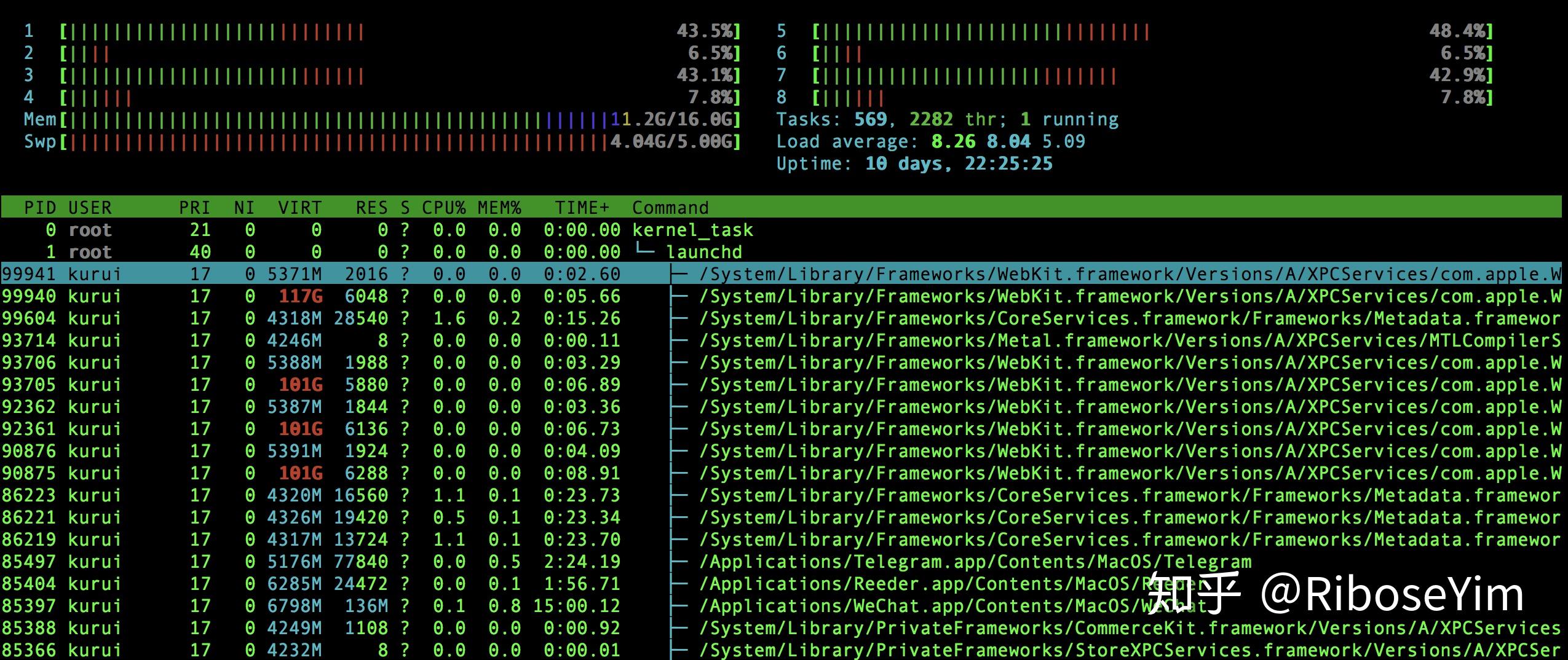 top 是一个快速诊断系统性能的工具。值得一提的是 top for Mac 与 Linux 上的输出不太一样。htop 优化了顶部输出格式,并支持大量的颜色, 键盘快键键和视图, 帮助我们洞察进程行为。更多信息: http:// hisham.hm/htop/