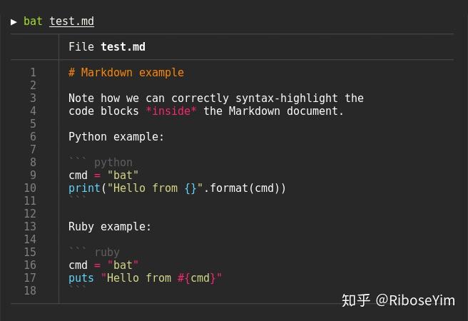 cat 被用于打印文件内容。ccat 工具还提供像语法高亮显示这样的功能。在此基础之上,bat 还支持 分页, 行号和 git 集成。同时允许在输出中搜索 (当输出长于屏幕高度时) 。更多信息: https:// github.com/sharkdp/bat