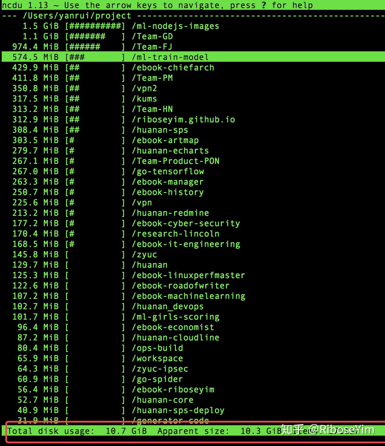 了解磁盘空间占用情况是一项非常重要的工作。常用的命令是 du -sh (-sh 表示摘要、便于人工阅读), 但我们经常需要挖掘目录的空间占用。ncdu 是一个替代选择(完全基于 C 语言编写,MIT 许可证)。ncdu 提供了一个交互式界面, 支持快速扫描哪些文件夹或文件占用空间, 并且导航非常方便。更多信息: https:// dev.yorhel.nl/ncdu