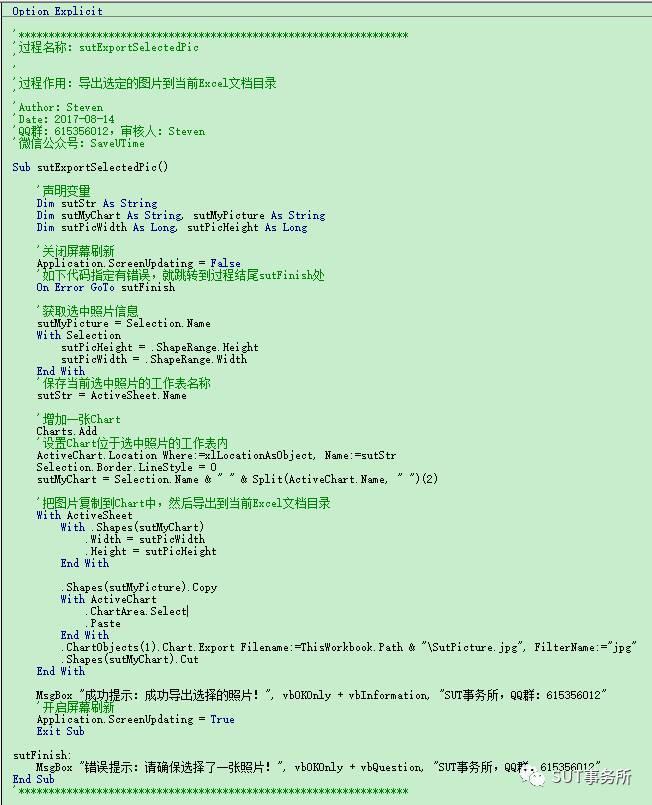 该方法通过选定需要导出的图片,然后通过VBA代码导出指定图片,具体实现代码如下: